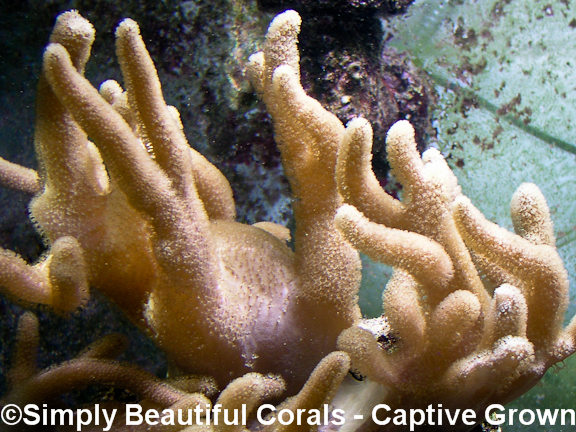 This finger leather has long finger like projections with many long extended polyps bunched close together giving this coral a fuzzy appearance. It is normal for the polyps to remain retracted for periods of time. Our colony has done best with moderate lighting and moderate to strong flow.