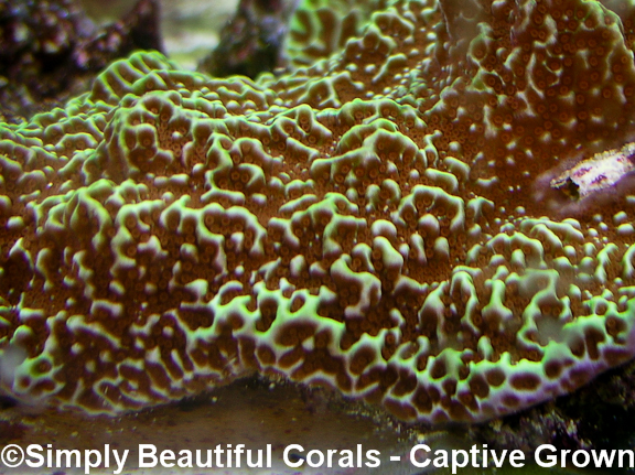 This neon green spongodes is an encrusting montipora which develops finger like vertical growth. This is a relatively easy coral to keep when kept in moderate to high lighting and flow.
