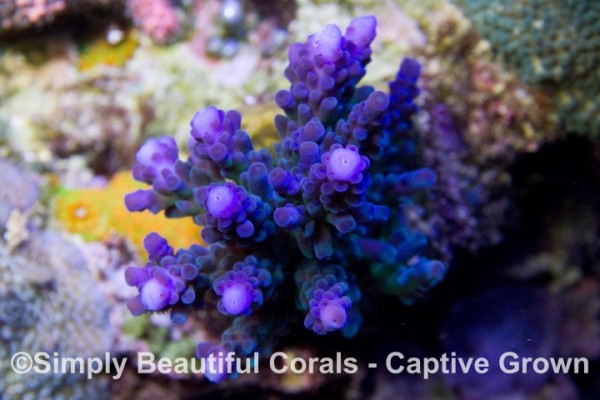 Acropora Tortuosa California Blue Tort staghorn is a stunning dark and light purple or blue with medium growth. Green base where light is low. Polys are blue to green. Not to be missed in any SPS aquarium.