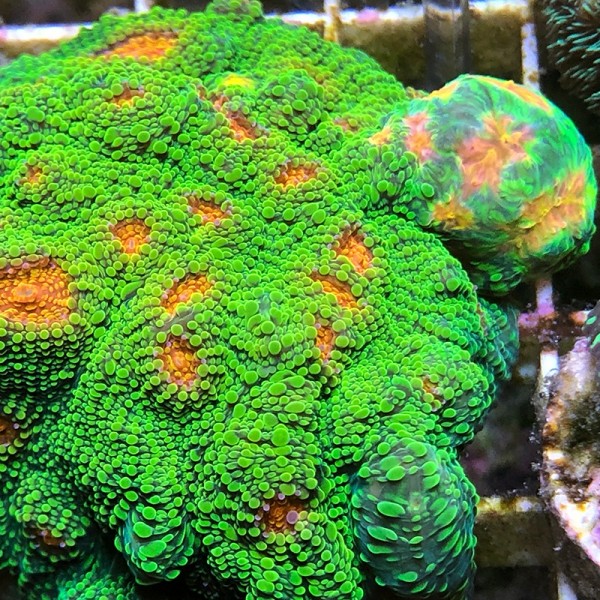 Aaaaaaaammmmazing colors. Blood orange/red on green! Glows under actinics! Limited stocks. Size 3/4"-1". At least one eye.